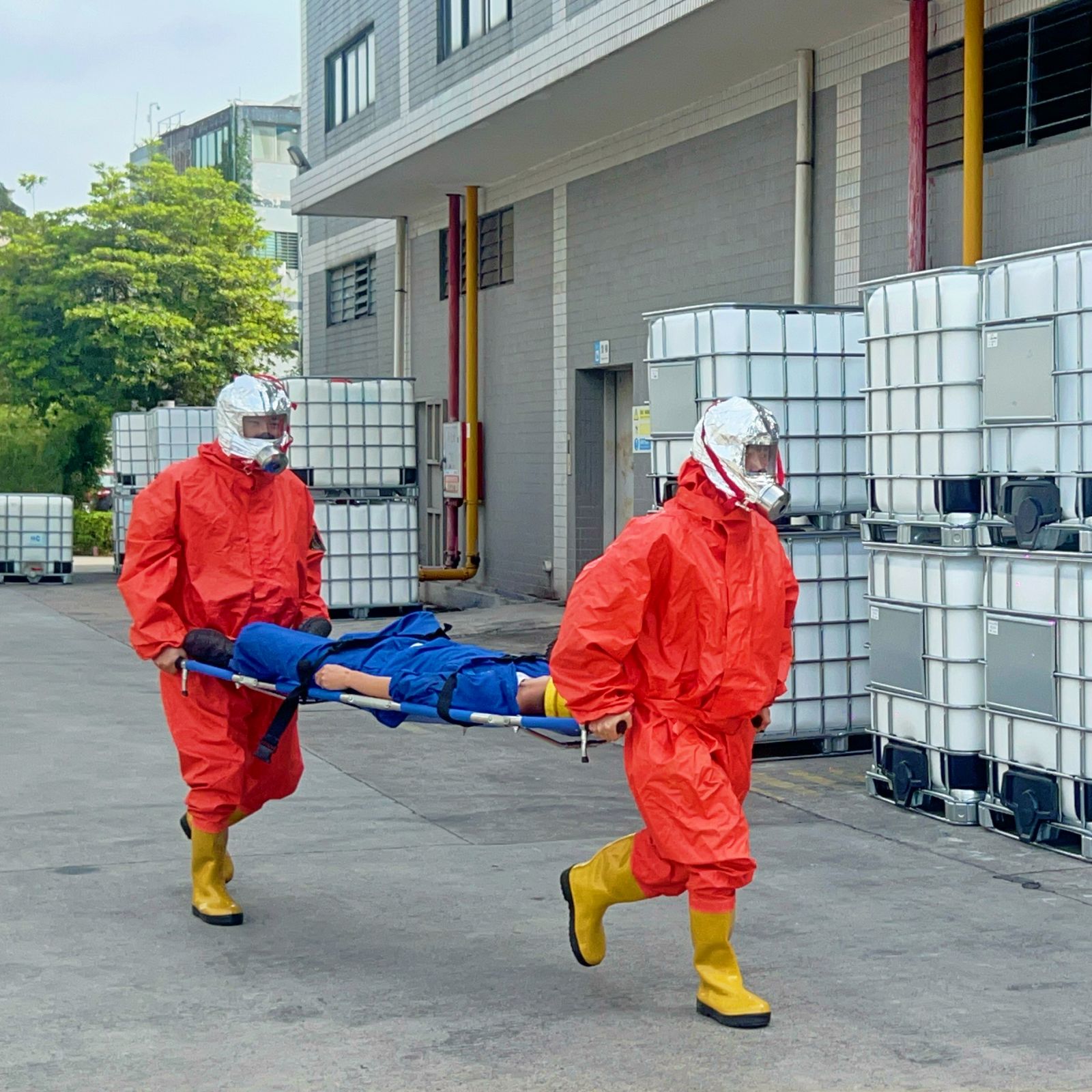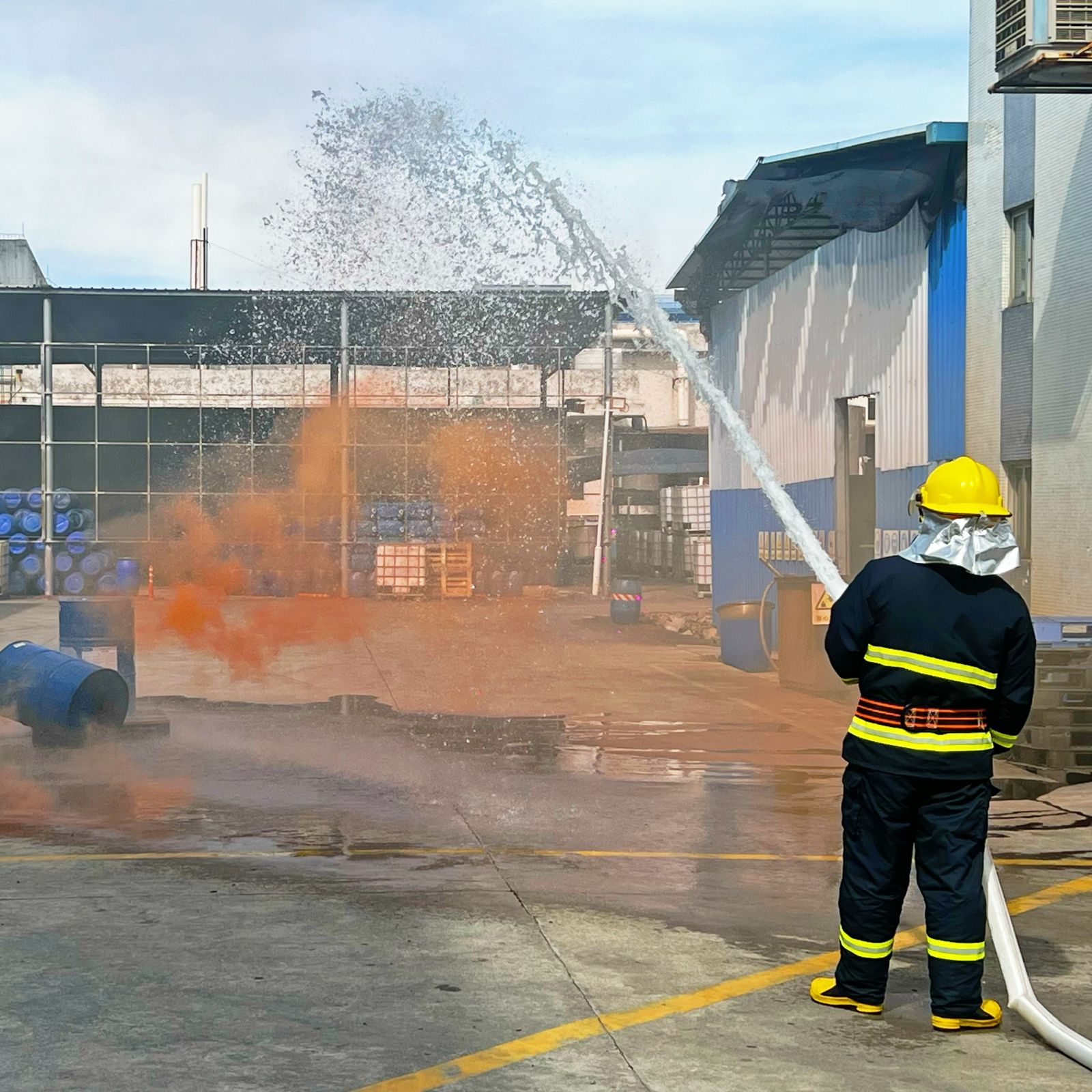 演练模拟了易燃液体在搬运过程中产生泄漏引发火情的紧急场景。事故发生后,现场人员立即启动应急程序: