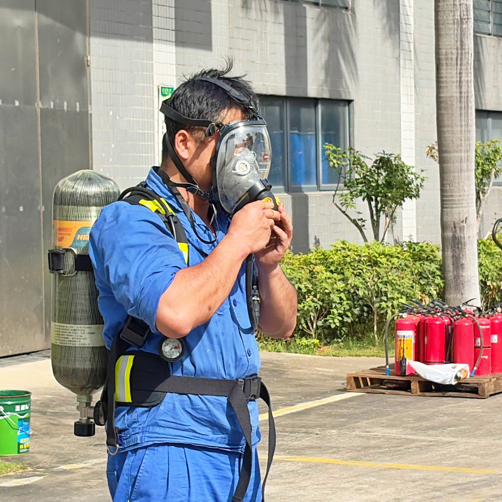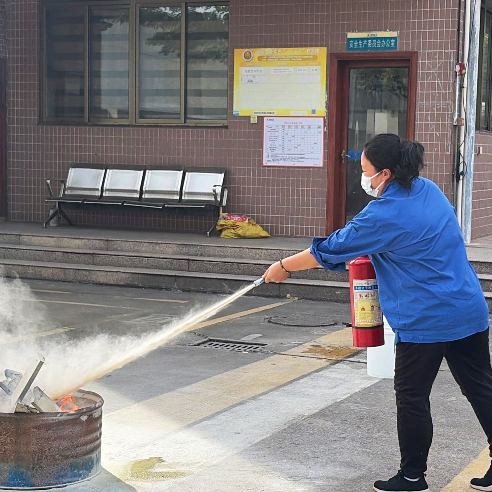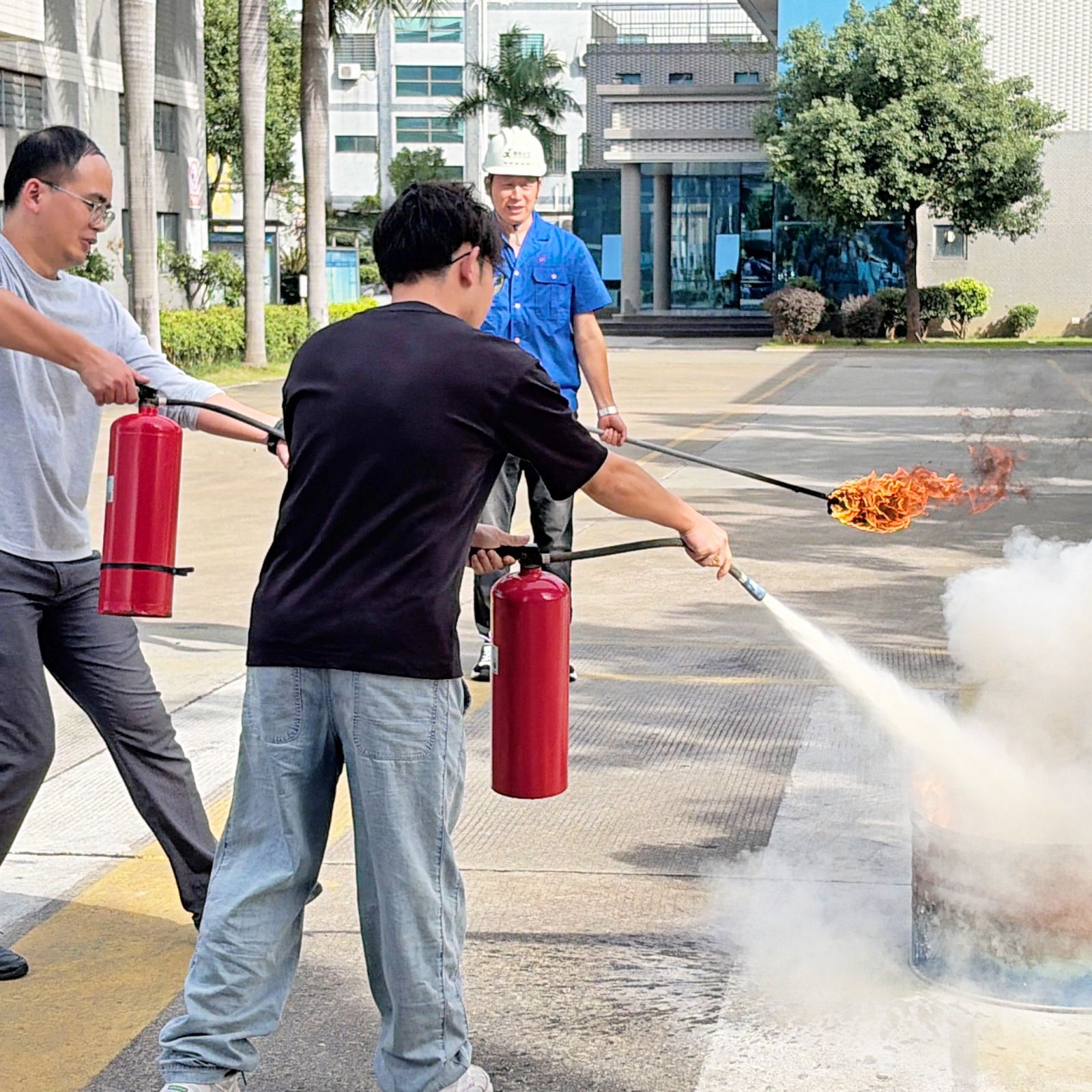 为深化演练成效,本次演练还设置了消防工具实操培训环节。安全专员现场演示防毒面罩和灭火器的使用方法,讲解落实到细处。随后,参训员工轮流上手,对模拟火源进行扑灭练习,安全部人员逐一纠正动作,确保全员掌握灭火技能。